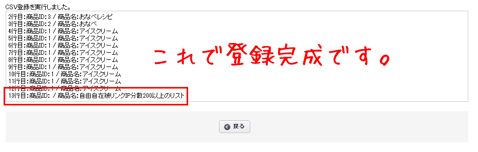CSV登録を実行しました。と出た画面で登録した商品が表示していれば完成です。