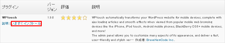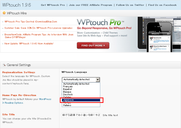 これがスマートフォン用プラグインの管理画面です。ここのGeneral Settingsと書かれている中のWPtouch Languageの下のプルダウンの中にJapaneseとあるのでそれを選択し、保存(save)します。