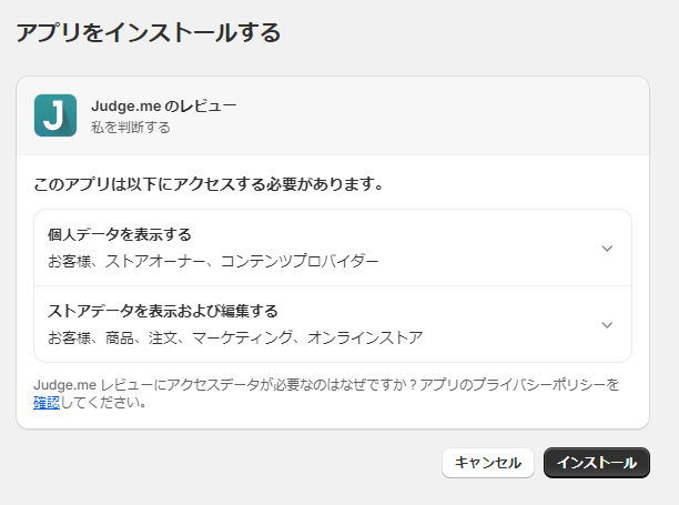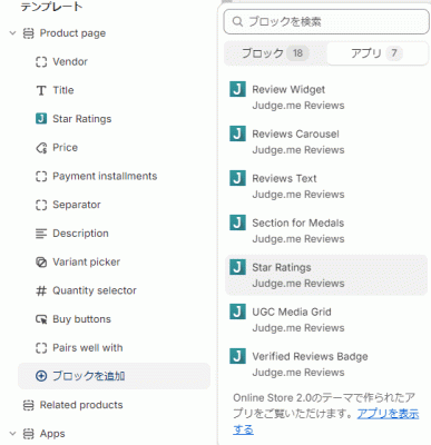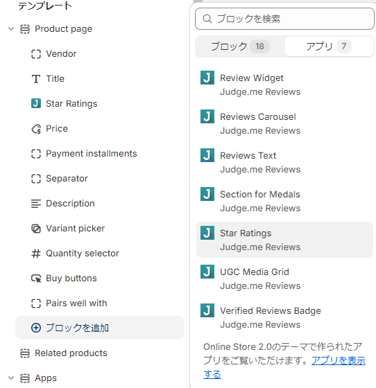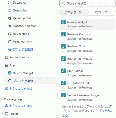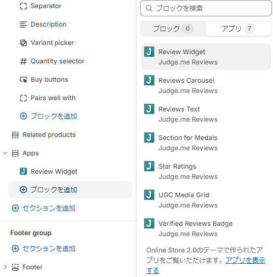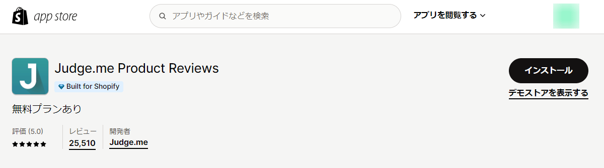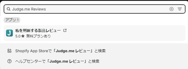 judge.me reviewsとショピファイで検索をします。