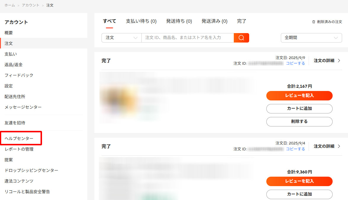 注文画面の左側のメニューのヘルプセンターからお問合せしてみました