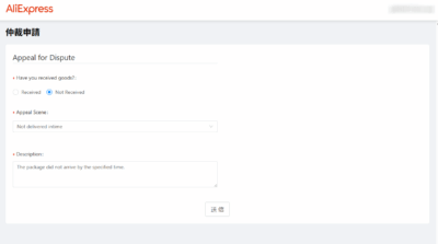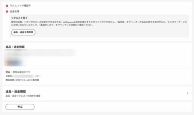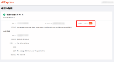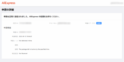 申請ステータスが却下となっていました。アリエクのサポートは嘘の情報しか言わず、また30日間の配送保証も全てうそでした。