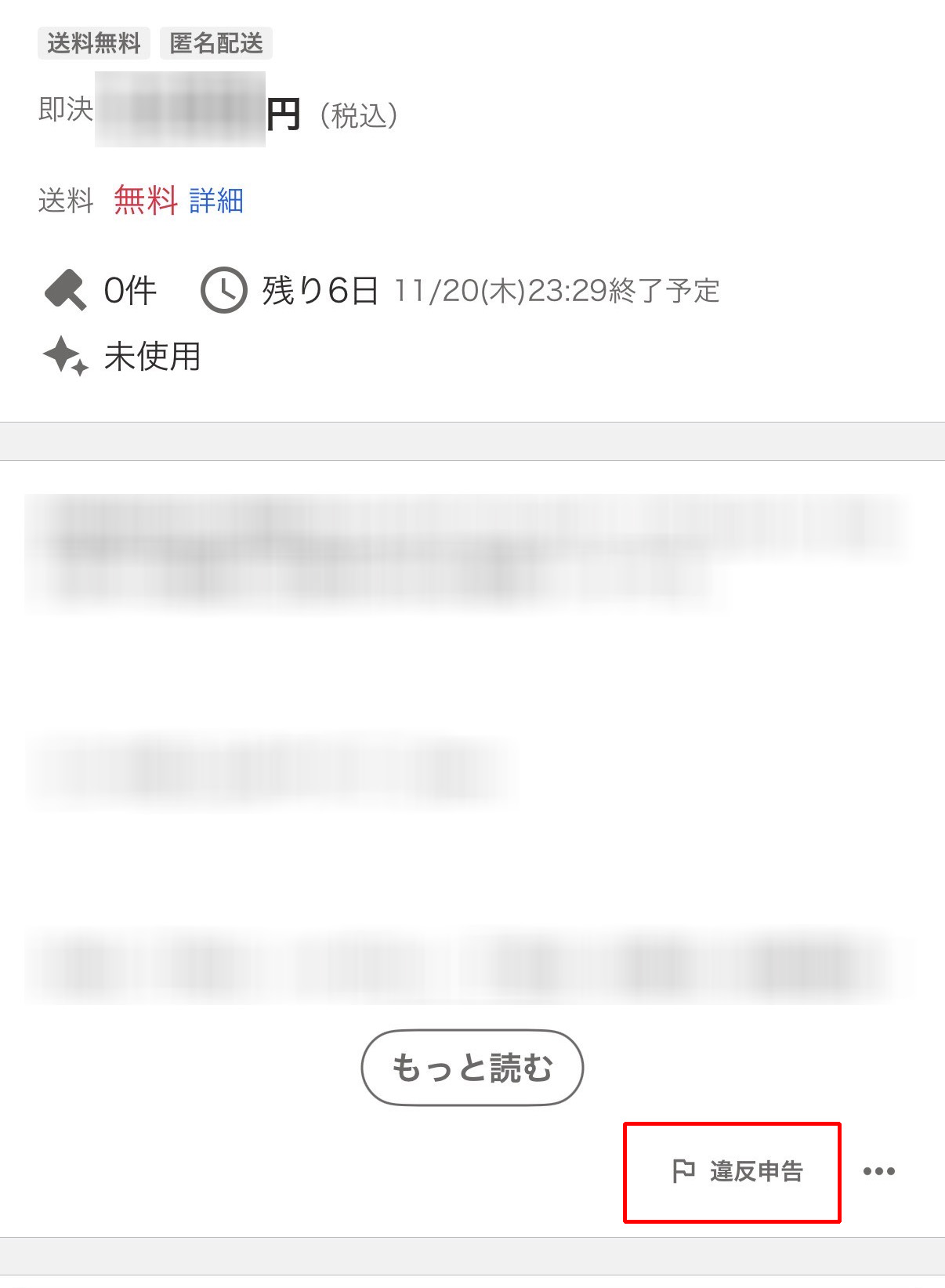 商品ページ内に商品説明が書かれている下に「違反申告」と言うボタンがあるので、そこをタップします。