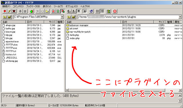 こちらにアクセスし、インストールしたいプラグインのフォルダをアップロードしてください。FFFTPを利用してワードプレスのプラグインをインストールする方法は以上です。