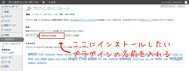 次に導入したいワードプレスのプラグインの名前を記入して下さい。今回はワードプレス用アドセンスの「AdSense Manager」と言うプラグインを導入します。
