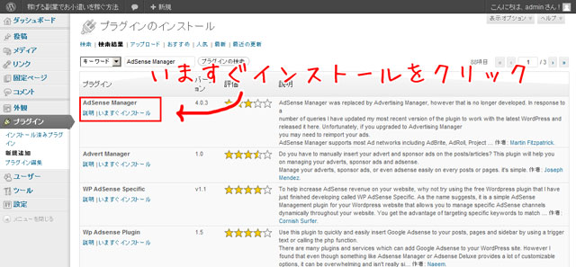 検索で出てきたAdSense Managerのタイトル下のいますぐインストールをクリックしてください。