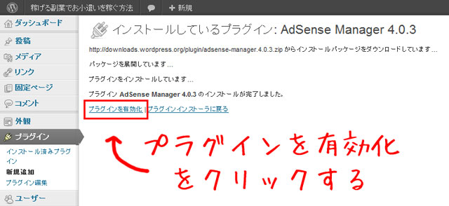 最後にワードプレスのプラグインのインストールが完了しました。と表示が出ればその下にあるプラグインを有効化をクリックしてください。
