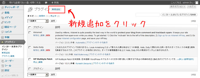 管理画面の左側にあるプラグインをクリックし、その後新規追加をクリックして下さい。