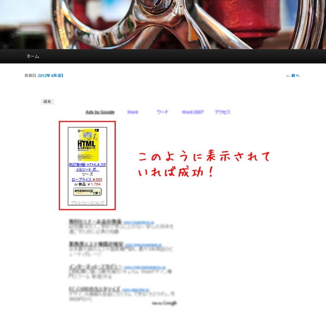 このように表示されていればamazonアフィリエイトの貼り付け成功です。これは商品のイメージとテキストを入れた場合です。