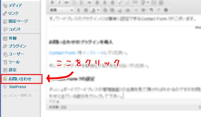 ダッシュボード(ワードプレスの管理画面)の左側を見て頂ければわかるのですがお問い合わせと出ている部分をクリックして下さい。