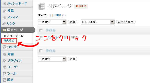 次に固定ページ > 新規追加をクリックして新しくページを制作いたします。