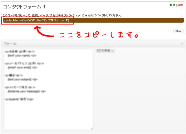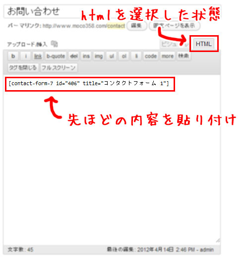 次にタイトルを「お問い合わせ」にして、「HTML」を選択した状態で先ほどコピーした内容を貼り付けし、保存して下さい。