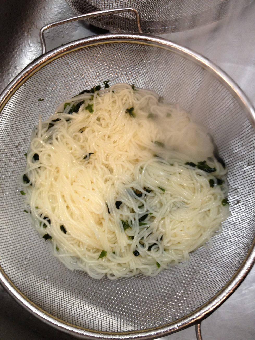 4、再沸騰したら1分半でざるにあげます。※黒いのはワカメです。急に入れたくなりました