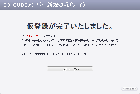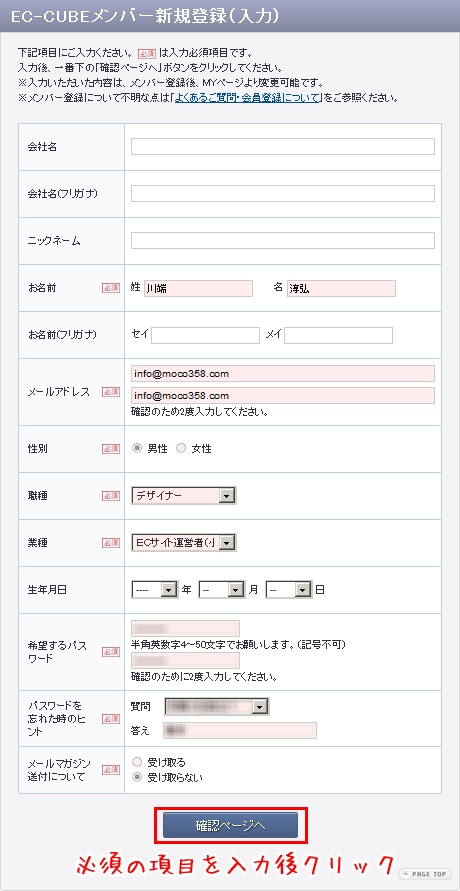 次にEC-CUBEメンバー新規登録内の必須項目を全て入力し確認ページへをクリックして下さい。