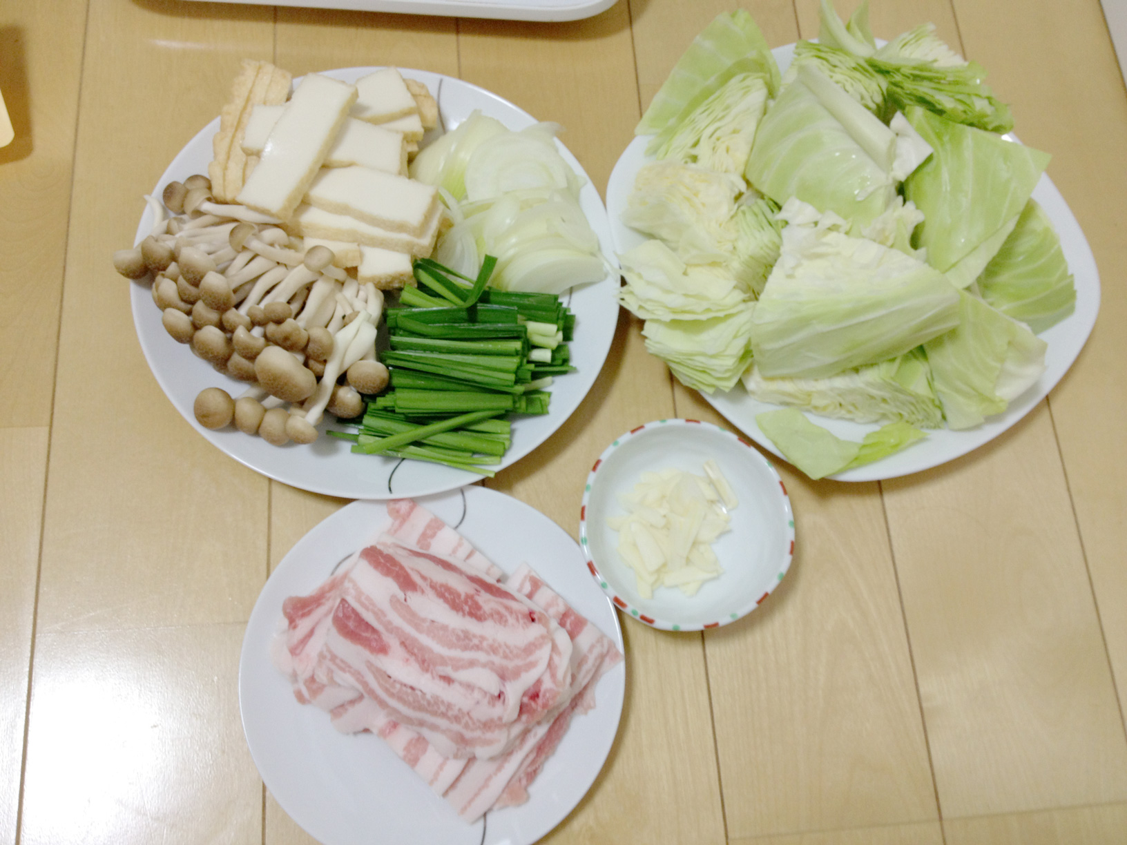 2、その間に具材を全て切っておき準備しておきます。キャベツはざく切りで、後は適当に切っちゃってください。